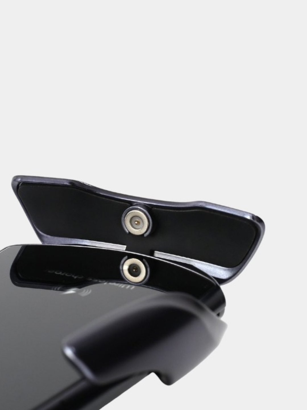 Держатель оснащен как беспроводной, так и проводной зарядкой, которая осуществляется с помощью магнитных коннекторов в комплекте. Вставьте магнитный переходник в разъем для зарядки телефона до характерного щелчка, а затем поместите в держатель.