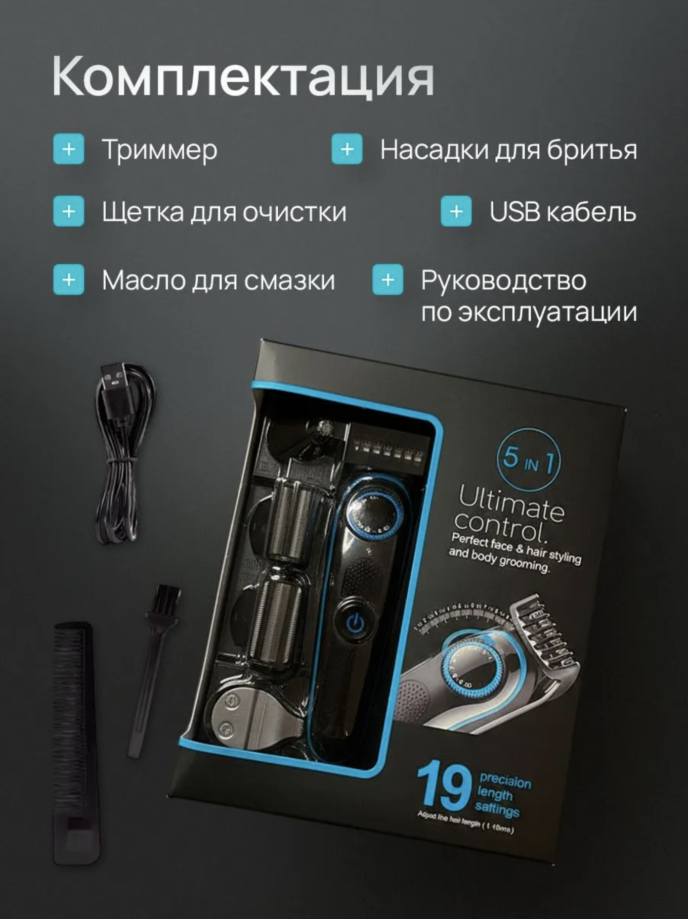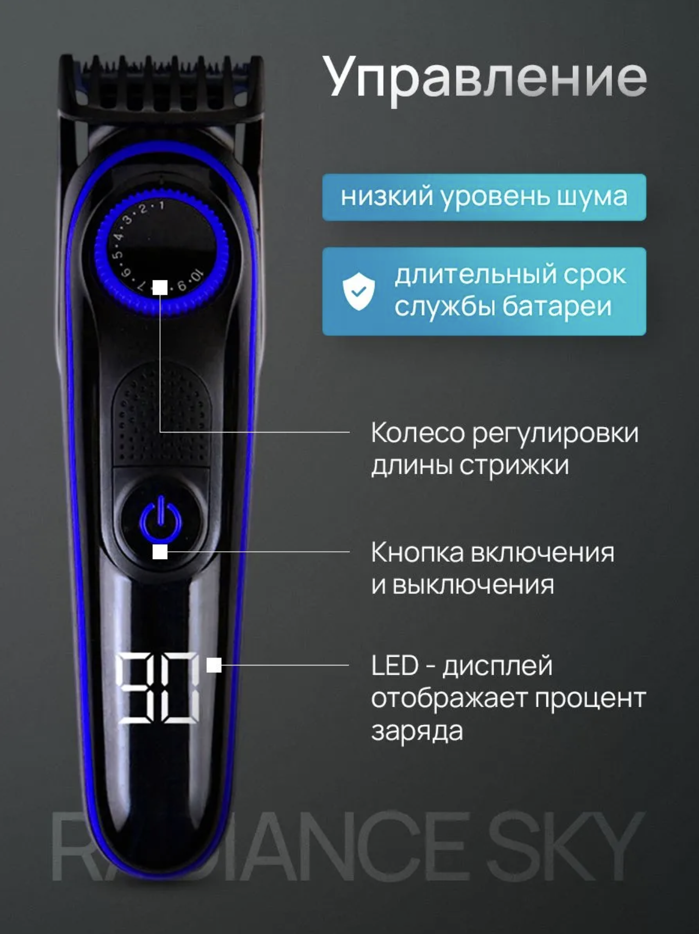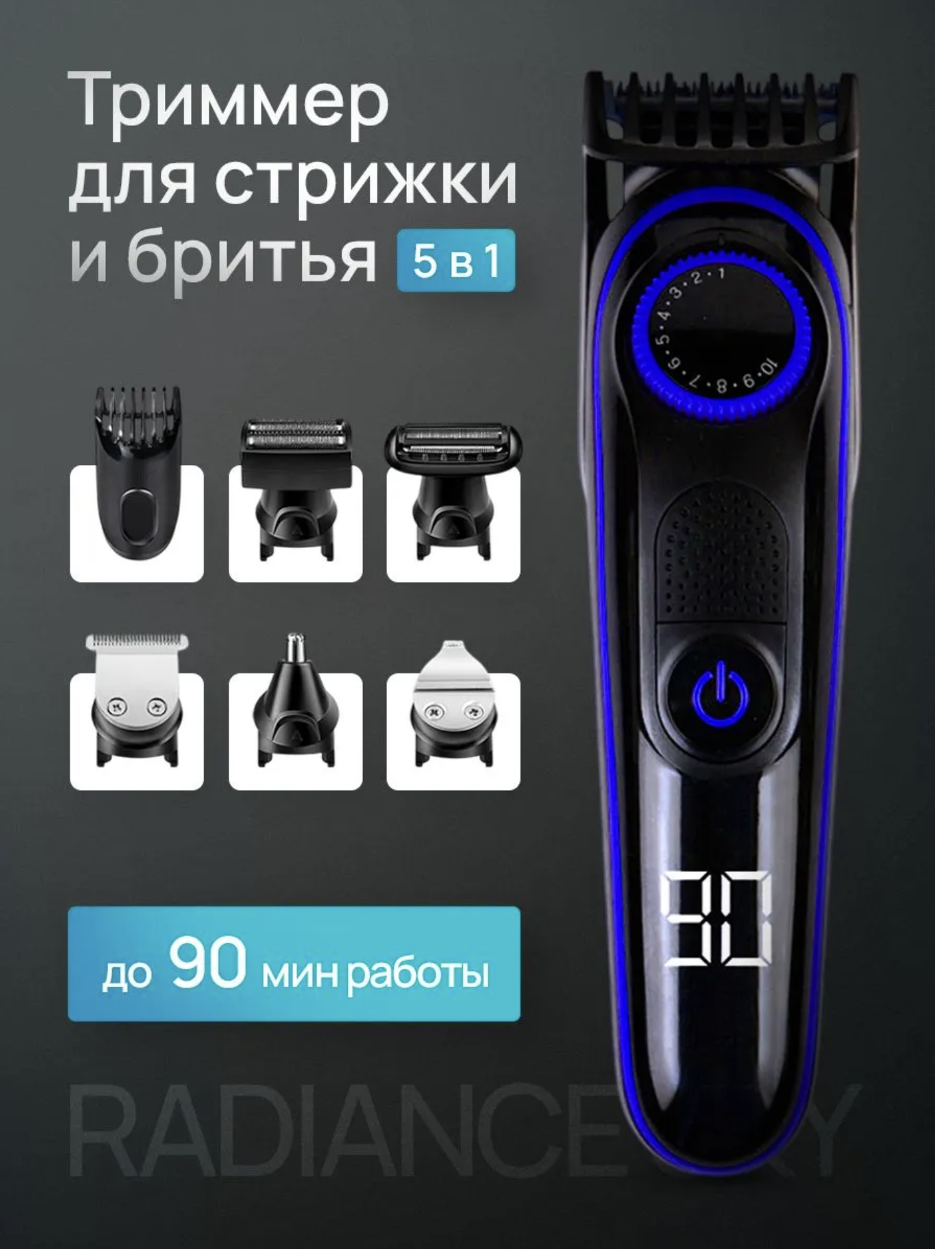 Беспроводной триммер 5 в 1 RADIANCE SKY – идеальный выбор для ежедневного ухода за собой! Компактное устройство электро триммер для мужчин оснащен шестью профессиональными насадками, филировки бороды и формирования четких контуров лица. Лезвия из высокопрочной нержавеющей стали обеспечивают ровную стрижку даже самых жестких волос, а регулировка длины вручную позволяет добиться нужного эффекта от минимального скоса до объемной формы.